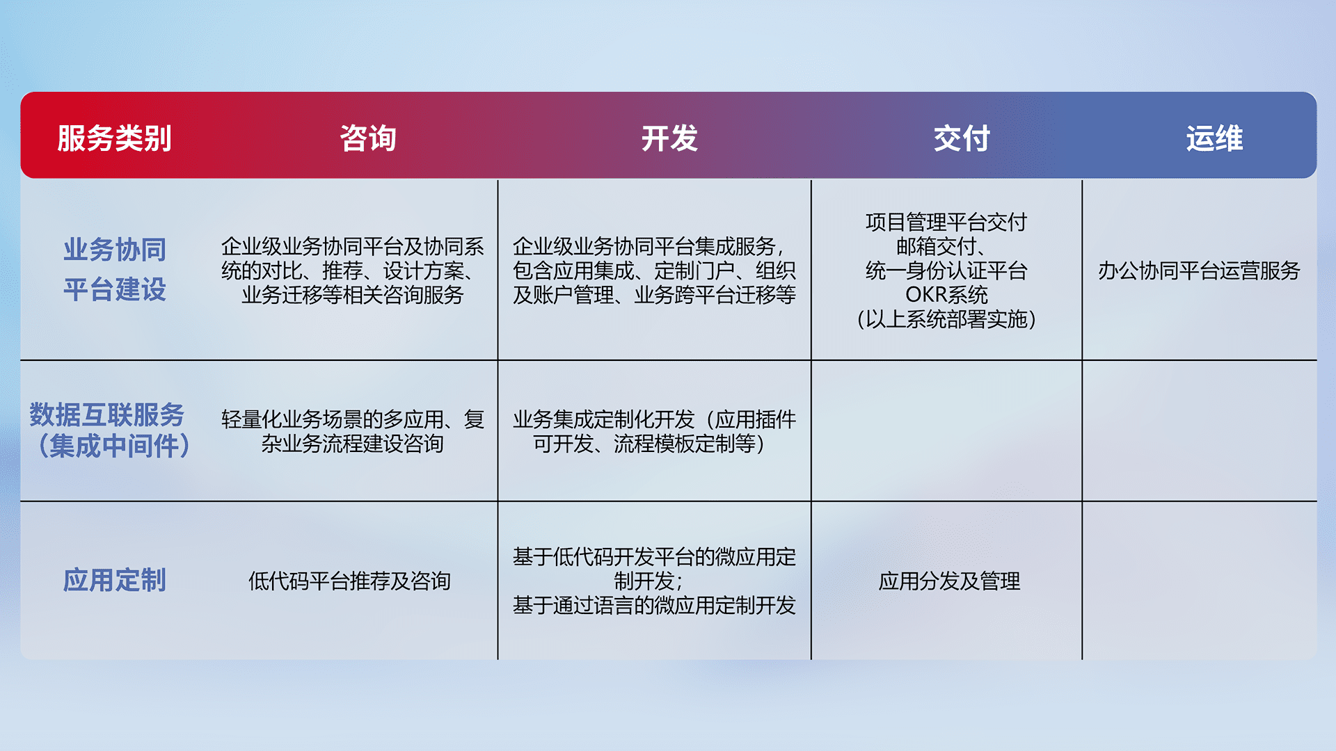 针对钉钉、、企微、、、、IDaas等平台级产品提供产品的规划、、、、方案、、、、交付、、、定制化开发等服务,,,,实现如统一协同办公、、、、智能客户服务、、混合会议管理、、智能数据查询、、、、等业务场景,,,,实现数字化转型。。